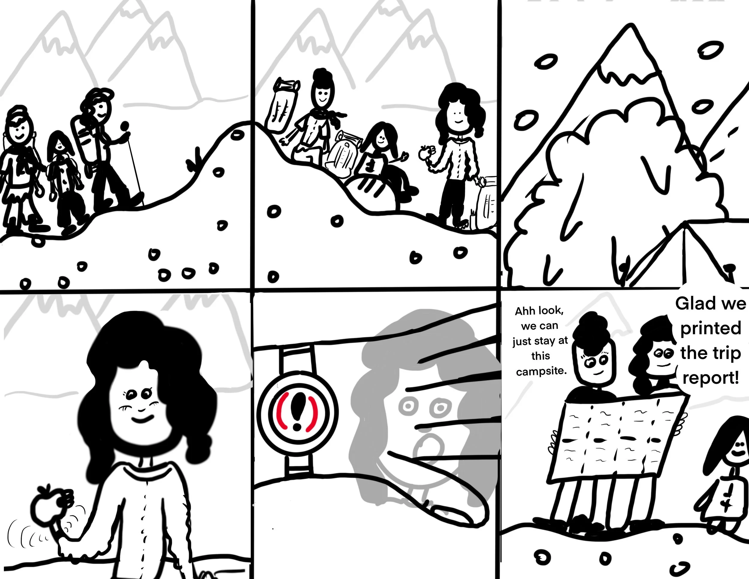 Storyboard 1: Kelly and her family are hiking to their campsite. Kelly receives an alert on her watch that there was an avalanche near her campsite. The family regroups and finds another site to say at. The camping trip continues.
